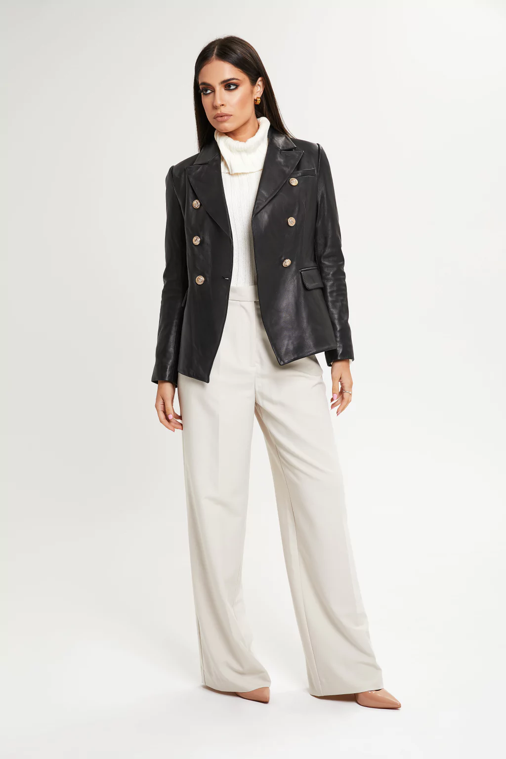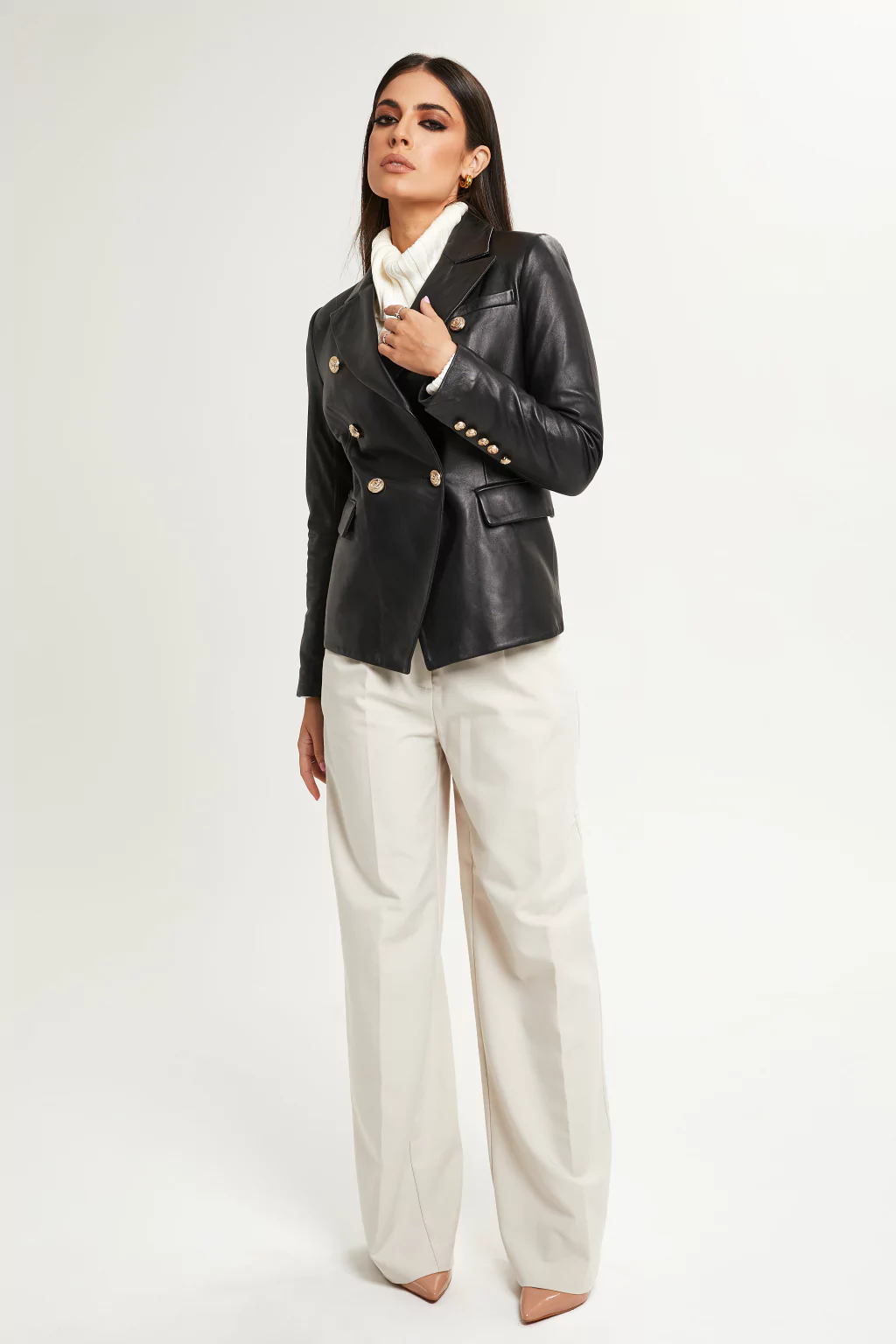 Blazer 100% em couro, com forro em poliéster, de modelagem mais justa ao corpo com botões cruzados. Possui lapela, bolsos funcionais e botões dourados na frente e mangas.
