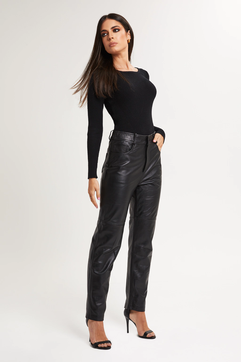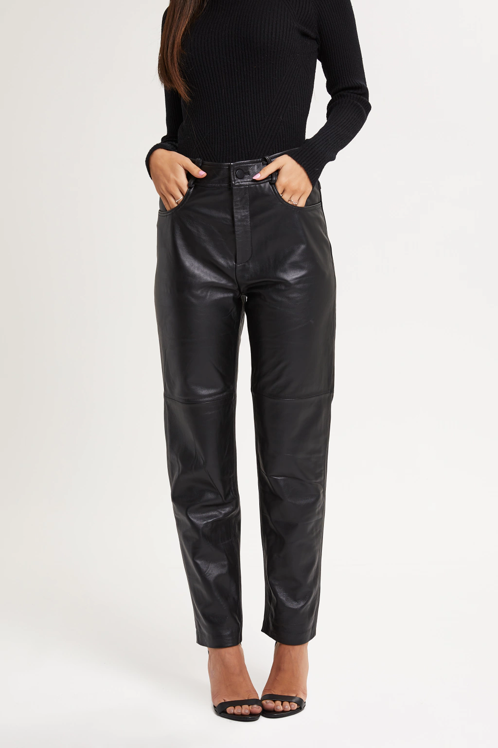 Calça de modelagem reta e cintura alta, 100% em couro. Possui recortes estratégicos que valorizam a silhueta e recortes que proporcionam maior liberdade durante os movimentos. Com passador de cinto, bolsos funcionais e fechamento frontal por zíper e botão. Comprimento tradicional.