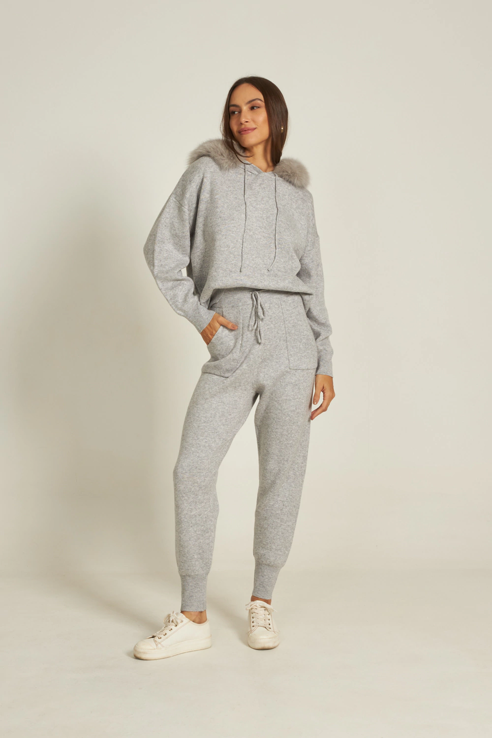 Conjunto de moletom em malha com mistura de lã e aplicação de pele natural removível no capuz. A blusa de moletom possui tiras para ajuste, e a calça modelagem jogger ajustada nos tornolezos, bolsos frontais e tiras para ajuste na cintura. Modelagem mais solta ao corpo, em tecido que proporciona maior elasticidade e conforto. Um conjunto clássico que combina o conforto e sofisticação para os dias mais frios.
