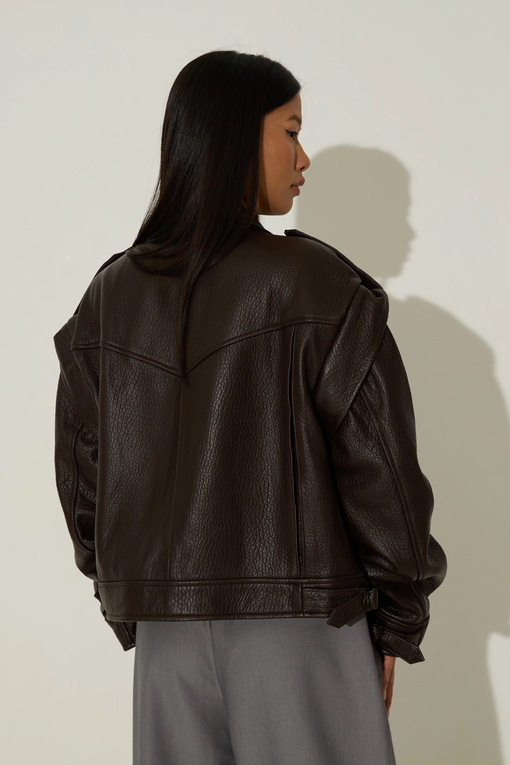 Descubra a sofisticação da nossa Jaqueta Biker confeccionada 100% em Couro Caprino. Sua textura rica em detalhes eleva a exclusividade da peça e a transforma em um verdadeiro statement de estilo. Com comprimento na altura dos quadris e um caimento amplo, esta peça combina estilo e conforto de forma sofisticada. Os maxi bolsos frontais e os recortes modernos adicionam um toque arrojado, enquanto as mangas removíveis por zíper oferecem versatilidade para diferentes ocasiões. Possui ajustes nos punhos e laterais e fechamento em botões. Uma escolha essencial para quem busca autenticidade e modernidade no guarda-roupa.