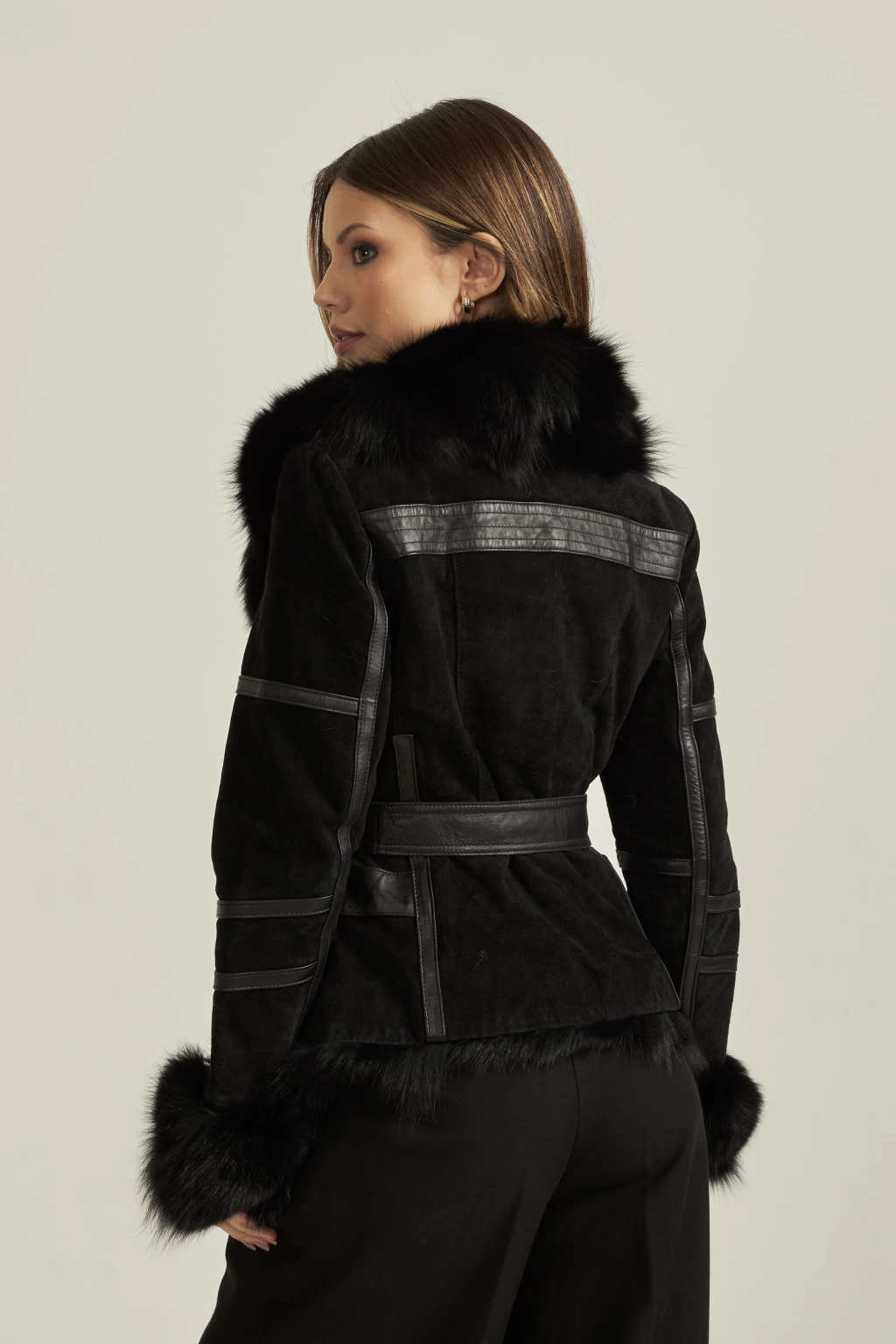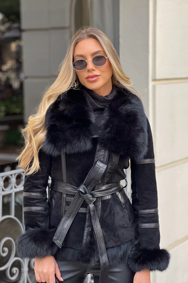 Nossa Jaqueta combina o Nobuck, de textura macia e suave, com o couro natural, que cria um mix de texturas interessante e sofisticado. A aplicação em pele nos punhos e na gola adicionam um toque luxuoso a peça, e proporcionam um maior conforto e aquecimento para os dias frios. A Jaqueta fica ainda mais completa com a faixa em couro na cintura. Possui bolsos laterais e fecho frontal em zíper.