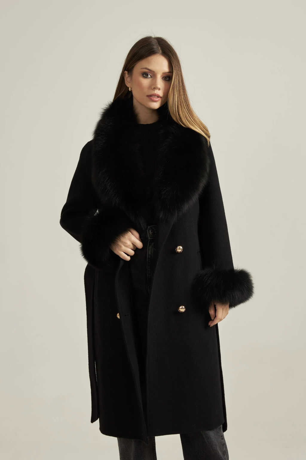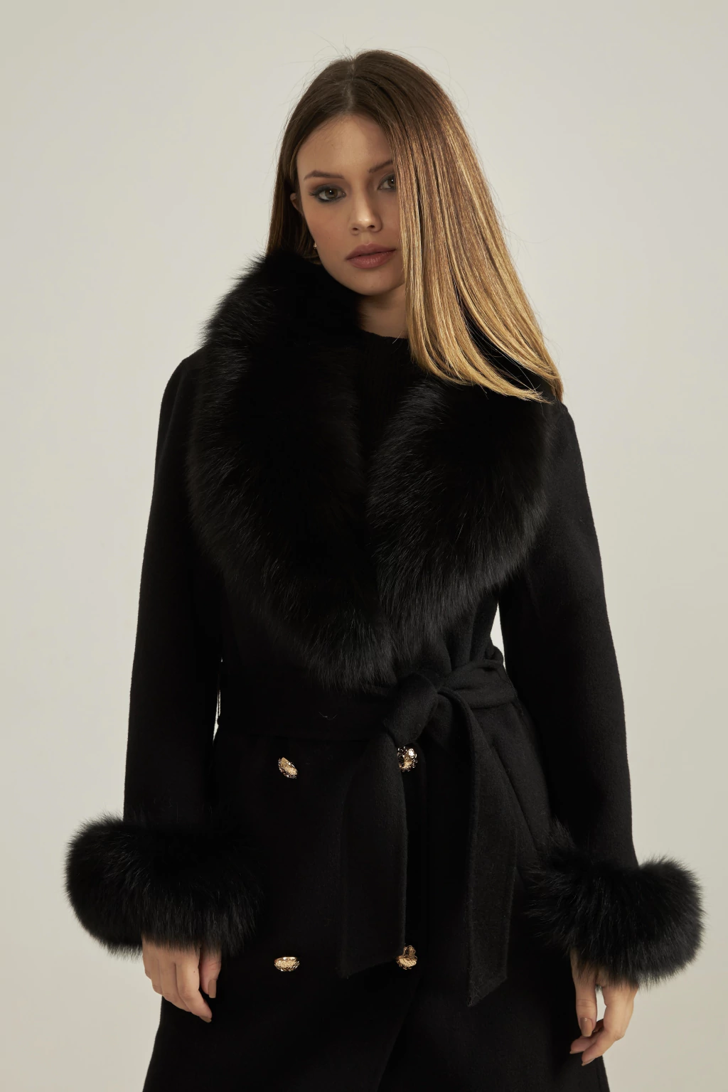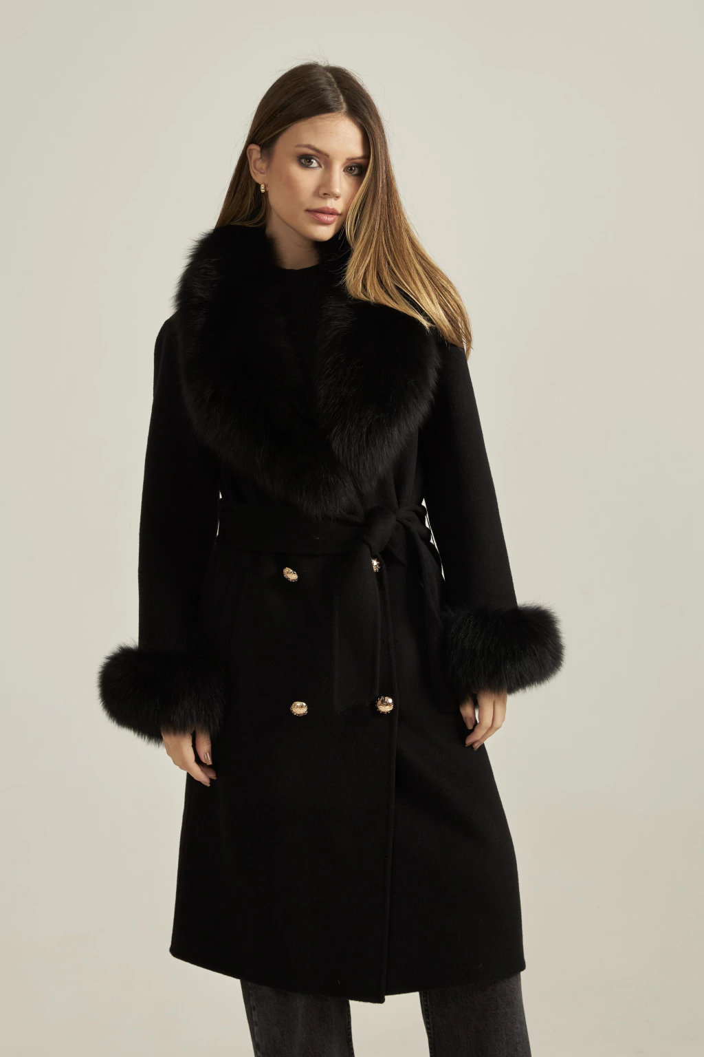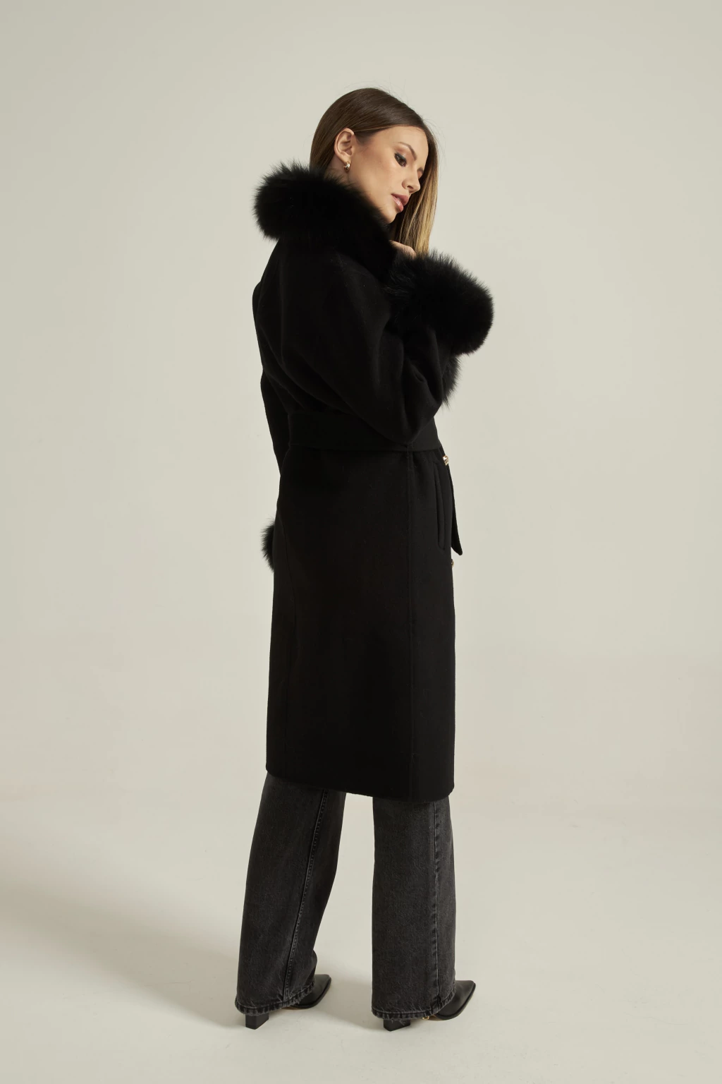 Sobretudo longo em 90% Lã e 10% Cashemere, com aplicação de pelo natural removível na lapela inteira e punhos. Bolsos frontais funcionais.
