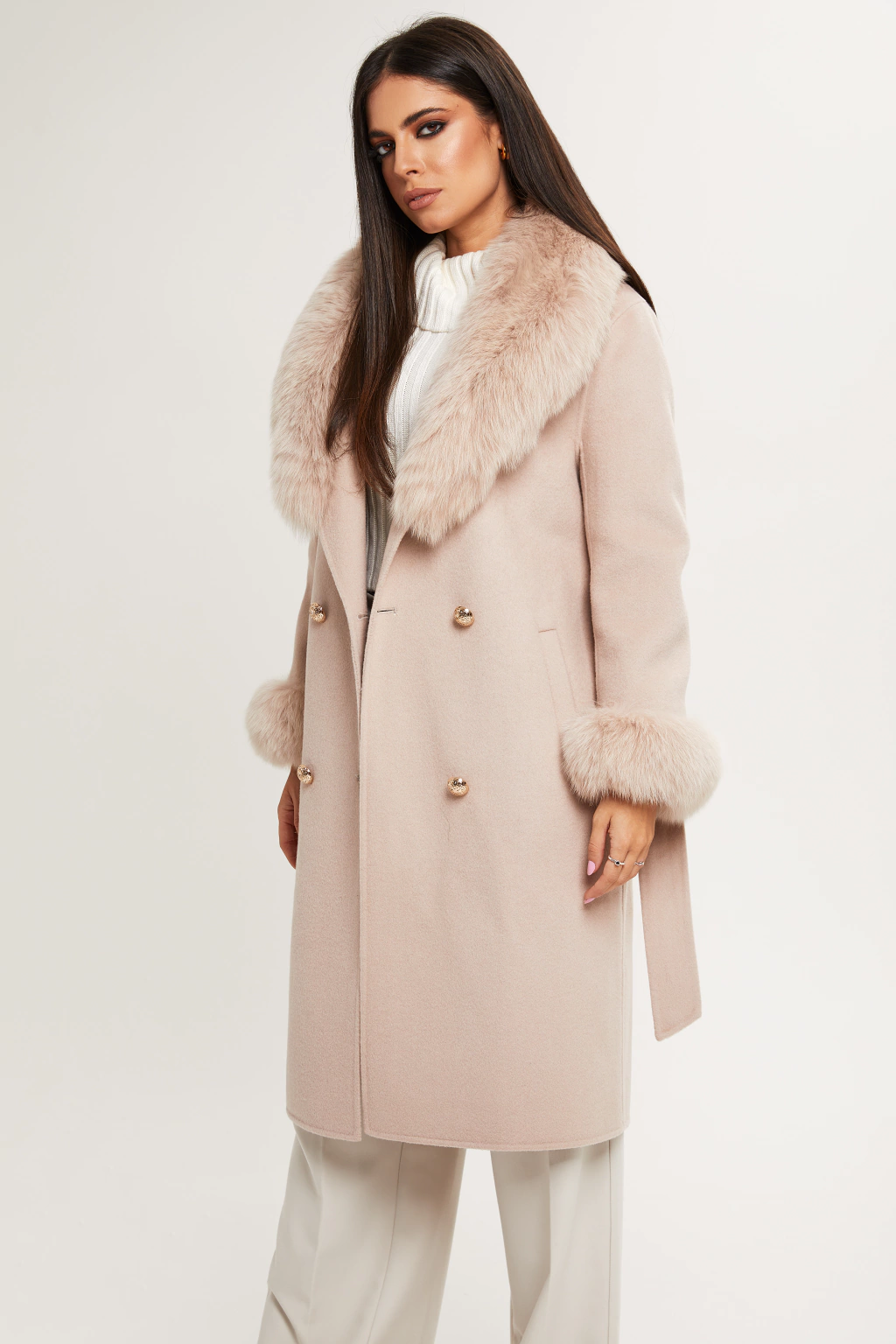 Nosso Sobretudo com aplicações em pele é a peça perfeita para trazer ainda mais elegância a seus looks de inverno. Confeccionado em uma mistura sofisticada de lã com cashmere, proporciona um aquecimento excepcional para os dias mais frios. As aplicações em pele na lapela e punhos, garantem um maior aquecimento enquanto conferem um visual luxuoso e exclusivo a essa peça. Você pode também remover as aplicações em pele, e explorar diferentes visuais, o que torna essa peça e a escolha ideal para diferentes ocasiões. Sua modelagem reta e comprimento abaixo dos joelhos, traz um ar clássico e refinado, enquanto os bolsos laterais em corte faca adicionam um toque de praticidade. A faixa para amarração na cintura e seus botões dourados, trazem um charme extra à peça. Uma peça indispensável para quem busca mais sofisticação e conforto durante o inverno.