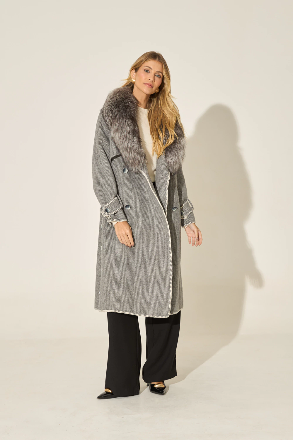 Apresentamos o nosso Trench Coat, que é uma verdadeira obra-prima para seu guarda-roupas. Confeccionado em lã com cashmere, possui um toque suave e incomparável. Sua padronagem espinha de peixe confere um visual atemporal e sofisticado a peça, que também é enriquecida por uma aplicação de maxi pele removível na lapela.